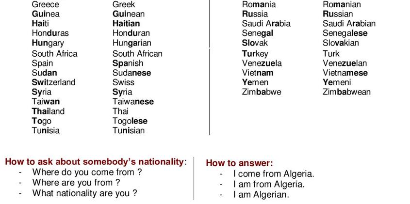 Below is a list of countries with the appropriate nationality. The Language that appears is the main language that is spoken in the country. We have not included all the languages that they may speak in that country. AUDIO