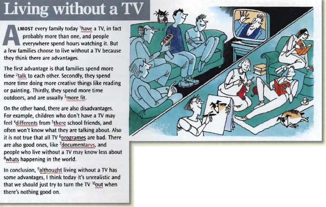 Almost every family today has a TV, in fact probably more than one, and people everywhere spend hours watching it. But a few families choose to live without a TV because they think there are advantages. The first advantage is that families spend more time talking to each other. Secondly, they spend more time doing more creative things like reading or painting. Thirdly, they spend more time outdoors, and are usually fitter. On the other hand, there are also disadvantages. For example, children who don't have a TV may feel different from their school friends, and often won't know what they are talking about. Also it is not true that all TV programmes are bad. There are also good ones, like documentaries, and people who live without a TV may know less about what's happening in the world. In conclusion, although living without a TV has some advantages, I think today it's unrealistic and that we should just try to turn the TV off when there's nothing good on.