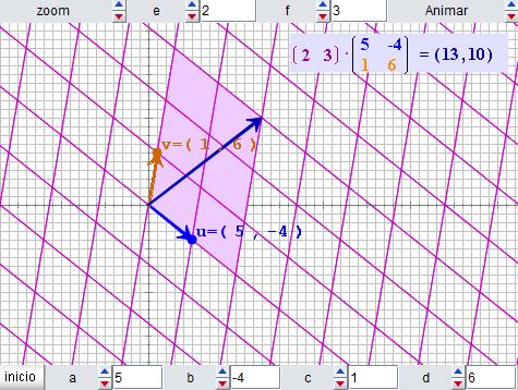 1. Pulsar el control Animar y observar que el vector azul oscuro es igual a 2u+3v, cuando e vale 2 y f vale 3, en general eu+fv