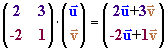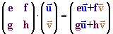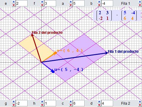 1. Pulsar los controles Fila "1 o 2" y observar que el vector azul oscuro es igual a 2u+3v, cuando e vale 2 y f vale 3, en general eu+fv. El vector marrón oscuro es igual a -2u+1v, cuando g vale -2 y h vale 1, en general gu+hv