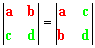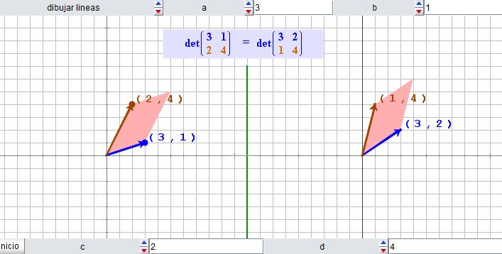 En la escena, se presenta a la izquierda el determinante de una matriz, y a la derecha, el de su traspuesta. Si variamos los valores de a, b, c, y d, es difícil ver que ambos paralelogramos coinciden. Veremos primero, geométricamente, que coinciden cuando la matriz es triangular. |