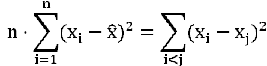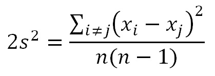 s2 mide las diferencias entre cada par de valores, da el valor medio de sus cuadrados (en realidad es la mitad de ese valor medio) sin considerar las diferencias entre datos iguales, por tanto salen n(n-1) sumandos.