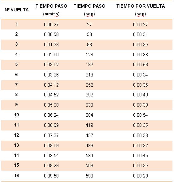 Ritmo medio vuelta = Tiempo total (seg) / Vueltas Totales