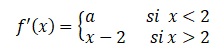 Estudiamos la derivabilidad en x=2 f'(2-)= a f(2+)=2-2= 0