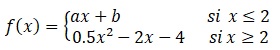 continuidad en x=2 f(2-)= a·2+b f(2+)= 0.5·22 - 2·2 - 4= -6